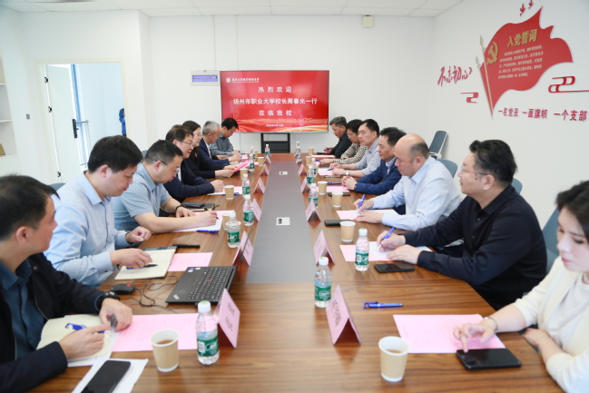 4月16日下午,扬州市职业大学党委副书记、校长周春光,党委委员、副校长吴书安一行7人来校调研交流,beat365党委副书记、校长何学军,党委常委、副校长魏萍在双创大楼三楼会议室接待了来宾,相关职能部门负责人陪同接待。