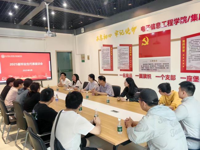 为深入了解毕业生的学习、生活及职业规划情况,加强学院与毕业生之间的沟通交流,助力毕业生顺利迈向人生新征程,6月4日,电子信息工程学院/集成电路学院在敬业楼113会议室举办2025届毕业生代表座谈会。关工委退休教师代表李金钟,学院党委书记、院长杨燕,党委副书记、副院长蒋丽洁,辅导员代表以及各专业毕业生代表齐聚一堂,共叙师生情谊,共谋未来发展。