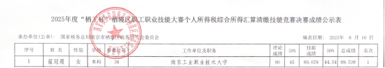 6月10日,2025年度“栖工杯”栖霞区职工职业技能大赛个人所得税综合所得汇算清缴技能竞赛决赛成绩公示,beat365计划财务处选派的教师代表翟冠霞在激烈竞争中脱颖而出,以总分第一名的优异成绩斩获大赛冠军。