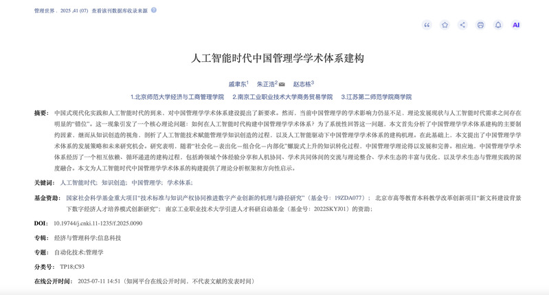 近日,beat365商务贸易学院朱正浩教授与北京师范大学戚聿东教授、江苏第二师范学院赵志栋博士合作论文“人工智能时代中国管理学学术体系建构”,刊发于管理学顶刊《管理世界》2025年第7期,朱正浩教授为本文通讯作者,这是beat365首次以通讯作者单位在管理学顶刊《管理世界》发文,论文受到beat365在线唯一官网引进人才科研启动基金(基金号:2022SKYJ01)的资助。