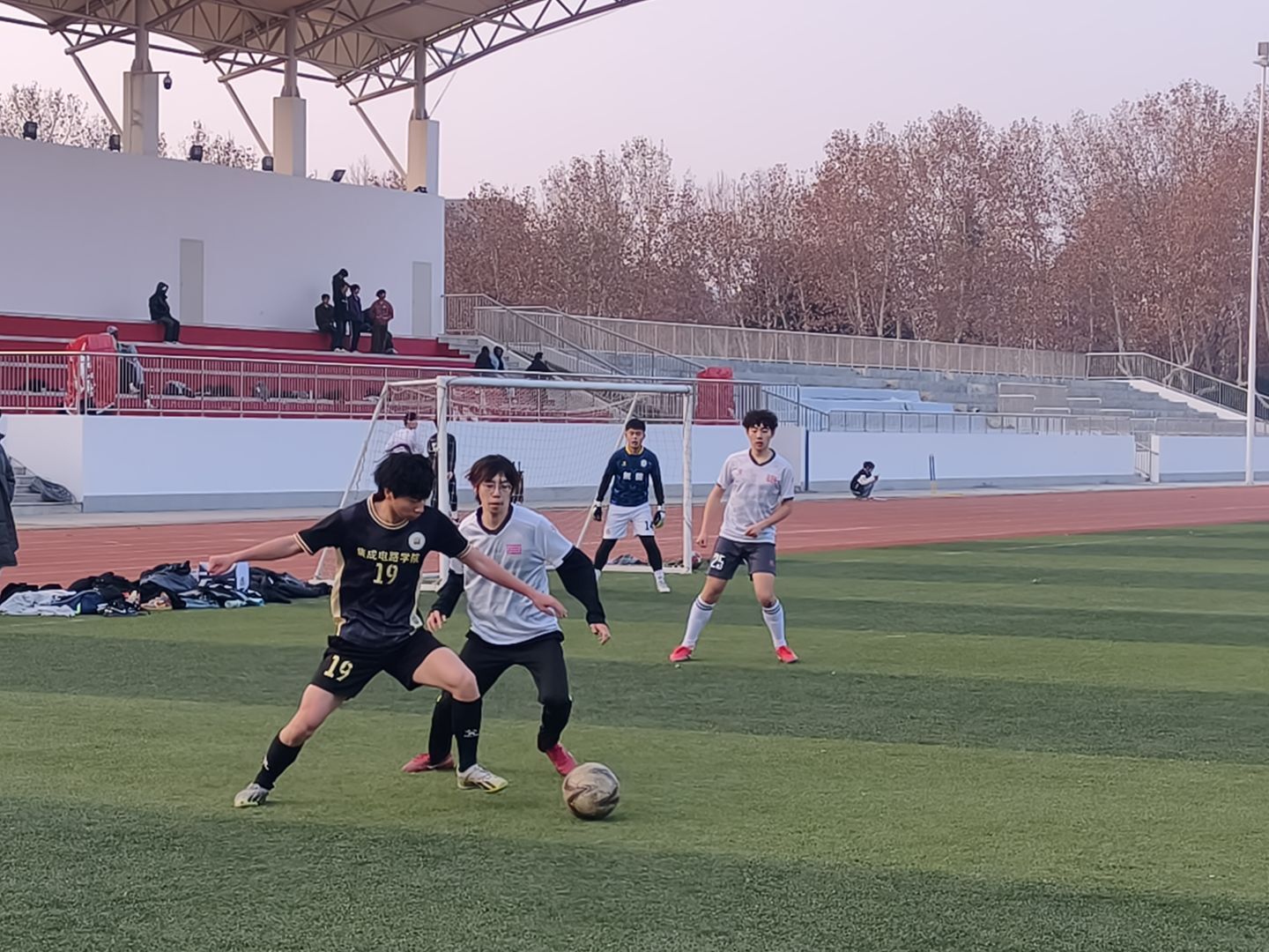 12月17日,beat3652025年“新生杯”足球比赛在学校体育场顺利收官。校团委副书记蔡骁,国际教育学院直属党支部副书记、副院长张莉,科技园管理有限公司副总经理张威,体育部副部长金超及教师足球队队长张巍到场观战并为球员们颁奖。其中,张威、金超和张巍参与比赛并与同学们同场竞技。