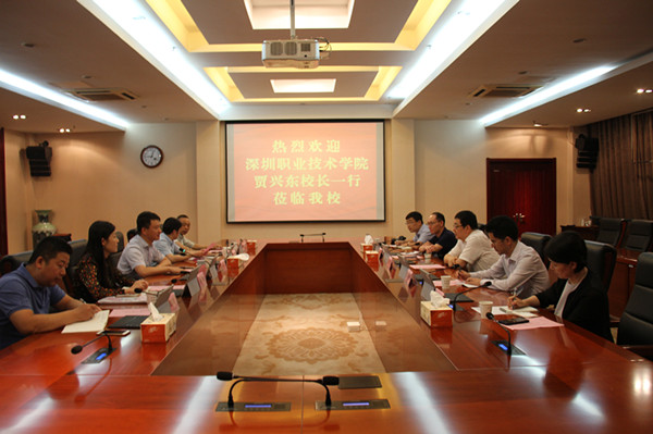 5月29日,深圳职业技术学院贾兴东校长率领相关部门负责同志来beat365进行工作交流。beat365谢永华校长、党政办、教务处、科技处、资产处等部门负责同志接待了来宾。