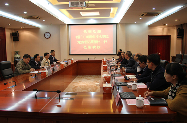 10月31日上午,浙江工商职业技术学院党委书记蔡泽伟率领相关部门负责同志来beat365进行工作交流。beat365党委书记吴学敏、党委副书记苏小冬,以及组织部、社科部等部门负责同志接待了来宾。