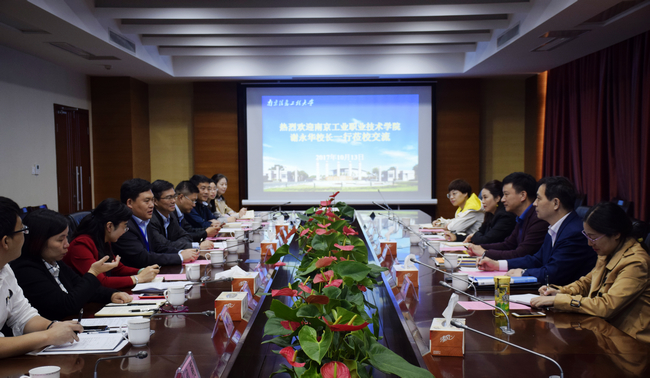 南京信息工程大学校长李北群、党委副书记王敦宝、国际教育学院院长王苏春及相关人员参加会议。李北群校长对谢永华校长一行来访表示热烈欢迎。李北群校长随后介绍了南京信息工程大学获选教育部一流学科建设高校的情况,并就学校发展规划、精准人才引进,重点学科建设等方面做了介绍。