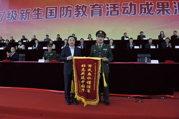国防教育成果汇报大会上,党委书记吴学敏代表学校向解放军陆军工程大学指挥军官基础教育学院贾卫主任赠送了“军民鱼水情意深,壮志共筑中国梦”的锦旗,感谢解放军陆军工程大学指挥军官基础教育学院对beat365的大力支持。党委委员、副校长苏小冬宣读了军训先进集体和个人的表彰决定。学校领导和嘉宾为获奖的“军训先进连队”、“优秀教官”、“优秀教导员”等集体和个人代表颁奖。