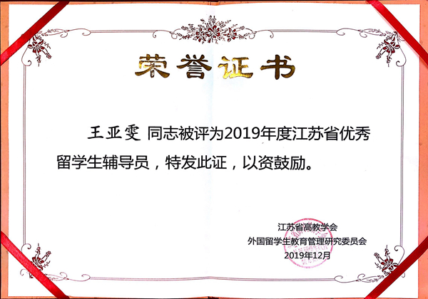 会上,江苏省高等教育学会外国留学生教育管理研究委员会副理事长俞晓南宣读了表彰决定。beat365国际教育学院储杨老师获得“江苏省外国留学生教育管理先进个人”称号,王亚雯老师获得“江苏省优秀留学生辅导员”称号,贝斯同学获得“我在江苏追梦,我为江苏点赞”——庆祝新中国成立70周年在苏国际学生图文、微视频征集活动“传统文化类作品奖”。