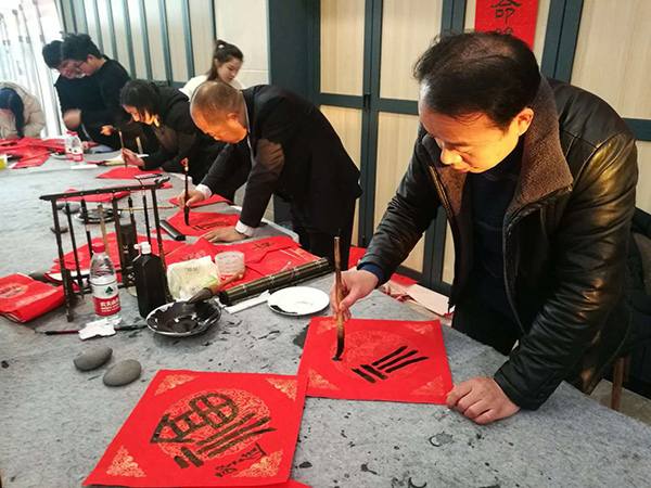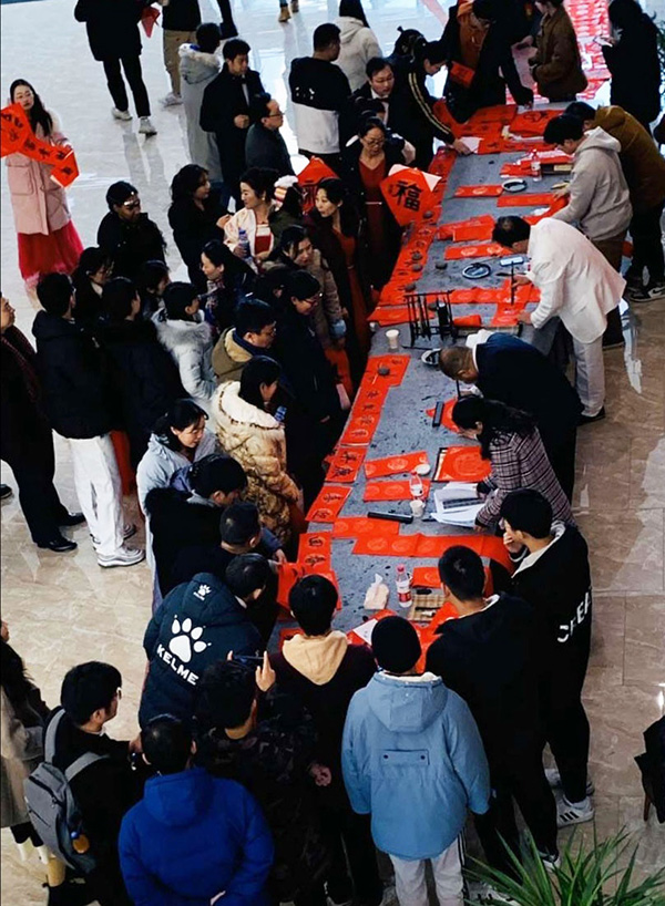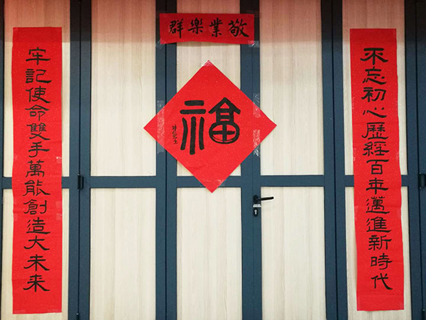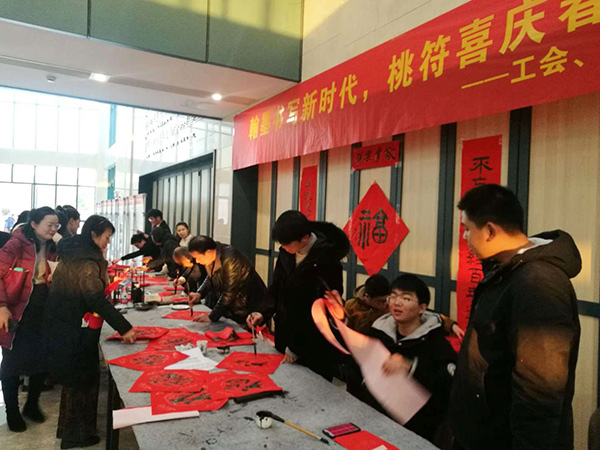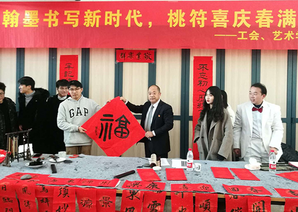 值此2020新年到来之际。南工院举行了辞旧迎新大联欢。工会,艺术设计学院,校书法协会联合举办了以“翰墨书写新时代,桃符喜庆春满园”为主题的送春联送福字活动。活动启动仪式由(全国)教育书画协会高等书法教育分会理事、校党委委员、纪委书记于林惠教授提笔书写“福字”开始,接着由(全国)教育书画协会高等书法教育分会会员、书法协会指导老师刘圣进书写自撰对联:不忘初心历经百年迈进新时代,牢记使命双手万能创造大未来。然后广大师生一起挥毫,数千师生积极参与。近年来,beat365书法艺术在三全育人,立德树人,增进学校文化氛围,提升师生文化自信等方面做了一些尝试,为学校文化育人作出了积极的贡献。通过这次活动,锻炼了书法协会同学们的动手能力,加强了广大师生员工的情感交流,也表达了书法协会新年深情的祝福:祝福祖国繁荣昌盛、人民幸福安康!祝福学校蒸蒸日上,又上新台阶!祝福全校师生新年快乐,万事顺意!