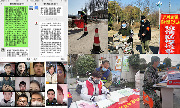 学院师生积极行动,为抗击疫情做好防护和宣传工作。学院党总支对全体党员提出要求,要求各支部组织学习并认真落实学校文件《致全校各基层党组织和全体共产党员的公开信》,自主学习习近平总书记关于防疫方面的重要讲话。各支部就文件学习展开讨论,分享学习体会,针对疫情防控措施提出有效建议。党员教师带头严格落实疫情防控举措。学生预备党员王振凌、孙建军、朱利荣等同学发挥党员先锋模范作用,主动协助班主任统计班级同学健康情况,带头响应“服从学院规定,不提早返校、复工”的号召。居家隔离、延迟返校期间,部分同学主动报名,做好防护措施,配合当地政府、社区,主动承担起道路管控、社区体温测量等防疫工作,充分展现了航空学子的风采。除了投身战疫一线,班主任、学生干部还通过线上方式,开展网络主题班会,带领同学学习《新型冠状病毒肺炎知识》、《高校疫情防控指导手册》,组织同学拍摄视频、签订承诺书为武汉加油,为中国加油。
