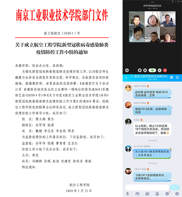 为贯彻习近平总书记关于坚决打赢疫情防控阻击战的重要指示精神,落实南京工业职业技术学院(本科)关于疫情工作的安排部署,航空工程学院全体成员迅速行动,在学校疫情防控工作领导小组的统一领导下凝心聚力、多措并举,积极为打赢疫情防控阻击战贡献力量。