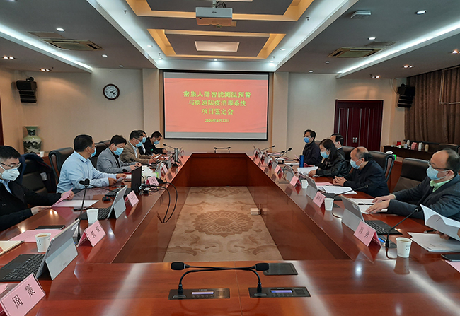 专家组首先现场观看样机演示,针对样机进行了询问,并听取了项目研发团队的研发思路、技术路线、实现方式、技术报告等汇报,并查阅了相关材料,经质询和讨论,形成鉴定意见。专家一致认为:经过试用与测试表明,该密集人群智能测温预警系统具有技术先进、稳定可靠、经济高效等优点,快速防疫消毒系统具有自动消杀功能,为疫情防控提供了新的技术路径和手段。专家建议进一步优化结构及参数,加大示范推广力度。