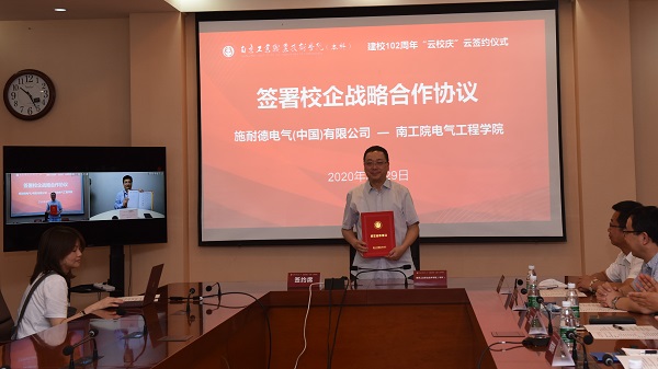 5月29日,电气工程学院与施耐德电气(中国)有限公司以“云签约”的形式签署战略合作协议。本次云签约活动由beat365科技处、发展合作处处长孟庆杰主持,学校党委委员、副校长崔新明,电气工程学院院长杨战民,施耐德电气工业自动化业务副总裁、OEM业务负责人崔志达,科技处、发展合作处、机械工程学院、电气工程学院、航空工程学院、商务贸易学院、艺术设计学院以及各签约企业相关负责人出席了签约仪式。