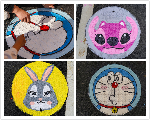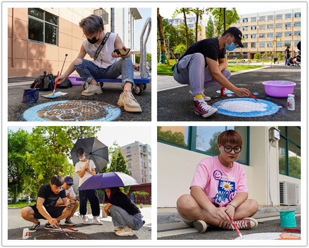 活动开始前,实践部的同学搜集素材,设计图案并分配井盖。活动当天,志愿者们先将井盖清洗干净并风干,随后化身“街头艺术家”,对井盖进行设计美化。一个个原本平淡无奇的井盖,被“艺术家”变成了一幅幅生动的图案,成为天堂校区里一道亮丽的风景线。