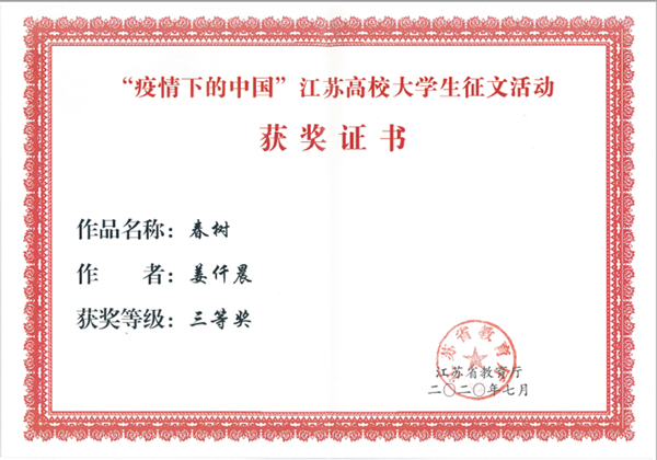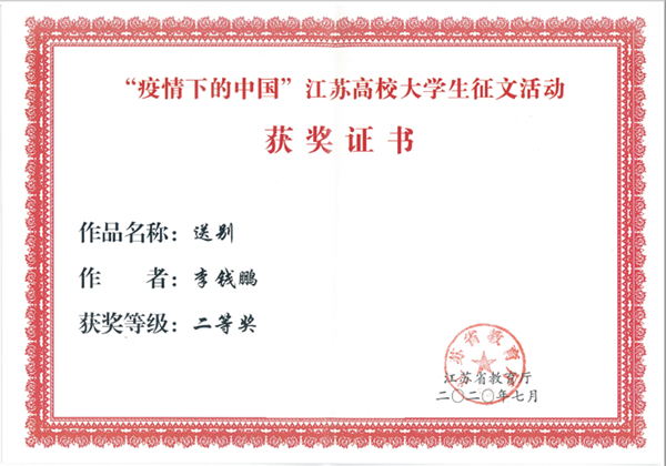 自活动开展以来,全校学生积极参与,经各学院初审,学校评选,共推选参评3篇征文作品,作品记录了同学们在疫情防控期间的难忘时刻和心路历程,讲述了抗疫期间人与人之间的温暖善意和真挚情感,书写了身边的抗疫感人事迹,强化责任与担当,树立爱国主义情怀,坚定决胜信心,传递出众志成城、共克时艰的强大正能量。最终beat365电气工程学院电气1814班李钱鹏同学的文章《送别》获得了省赛二等奖,建智1911班姜仟晨同学的文章《春树》获得省赛三等奖。