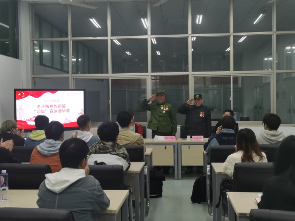 报告会伊始,钱洪林老战士首先分享自己参军和入党的初心,在参军入伍后勤学苦练驾驶技能,上战场后不怕牺牲,坚决完成党和人民赋予的任务,服从组织安排,积极投身新中国社会主义建设大潮当中。退伍后,复员至金陵石化,在担任厂长期间,始终坚守初心,为工人谋福利,为工厂谋发展。随后,李海老战士与同学们分享了自己在新疆建设核试验基地和西昌卫星发射基地的艰苦奋斗故事,退伍后在汽车运输公司将自己在部队所学到的知识和经验传授给年轻人,为地方建设服务,为改革开放服务,为人民服务。报告会最后的提问环节,学生党员代表王润生向二位老兵提问,在当代,青年大学生应该如何继承和发扬老一辈革命家的优良传统。二位老兵回答道:“当代学生应当不忘初心,从‘四史’中汲取力量,努力学习科学文化知识,世界形势在变化,作为大学生就应该学好专业知识,是为了个人的发展,更是为了国家的富强,民族的兴旺。”