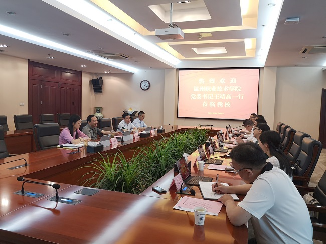 6月10日上午,温州职业技术学院党委书记王靖高一行来beat365考察调研。党委书记吴学敏,以及党委办公室、校长办公室、教务处(教师发展中心)等部门负责同志在行政楼辅楼一楼会议室接待了来宾。