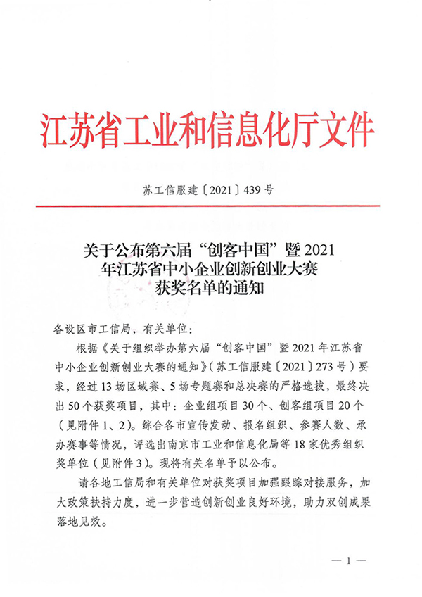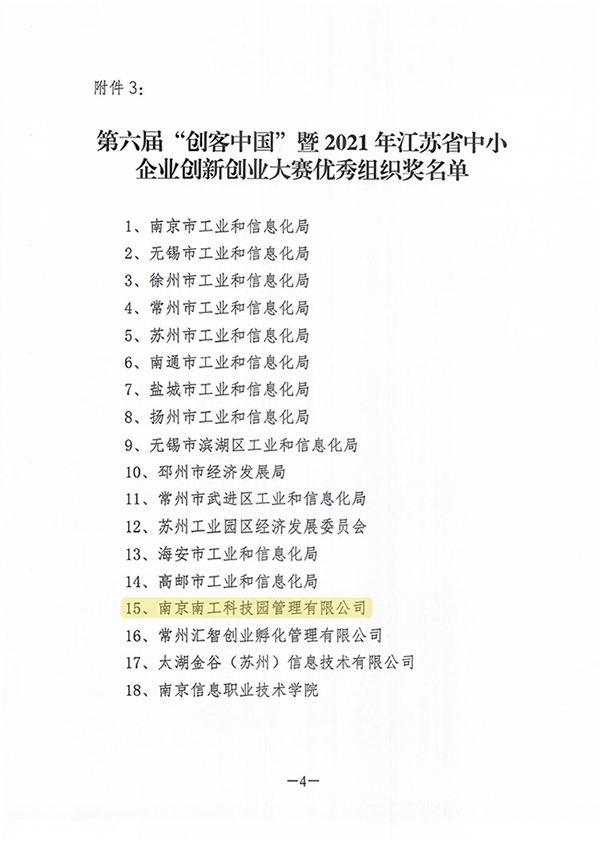近日,第六届“创客中国”暨2021年江苏省中小企业创新创业大赛顺利落下帷幕,江苏省工业和信息化厅综合各市宣传发动、报名组织、参赛人数、承办赛事等情况,评选了大赛优秀组织奖,beat365大学科技园运营公司——南京南工科技园管理有限公司名列其中。