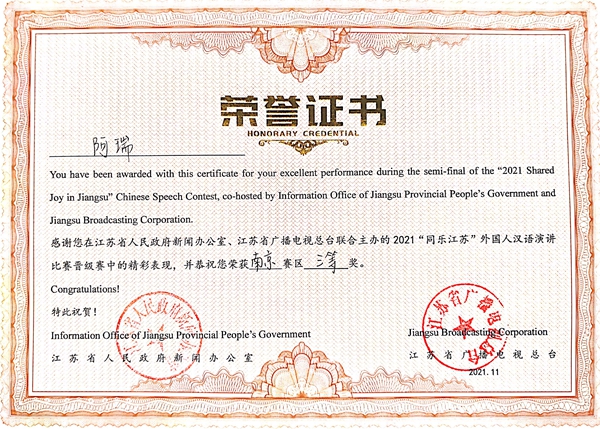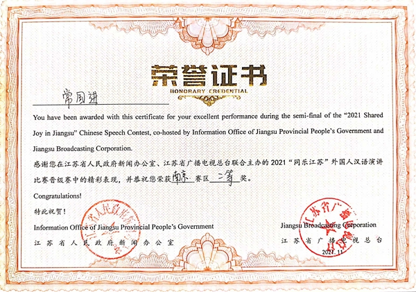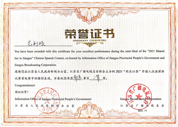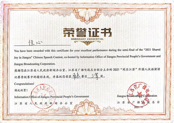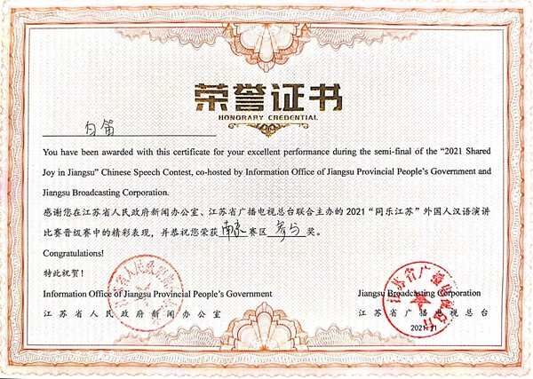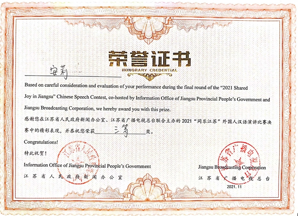由江苏省人民政府新闻办公室、江苏省人民政府外事办公室、江苏省教育厅等单位共同主办、江苏省广播电视总台承办的2021“同乐江苏”外国人汉语演讲决赛通过云录制的方式举行。来自五大洲20多个国家的100多名留学生汉语达人参与比赛,经过激烈地角逐,beat365留学生安莉同学获得总决赛三等奖;常国进、尤利娅两位同学获得南京赛区二等奖;阿瑞、佳心同学获得南京赛区三等奖,白迪同学获得参与奖,取得了“同乐江苏”比赛有史以来最好成绩。