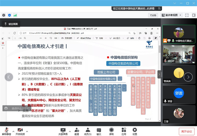 为了贯彻落实国家发展和改革委员会、教育部、工业和信息化部、人力资源和社会保障部、农业农村部、国务院国有资产监督管理委员会、中国共产主义青年团中央委员会、中华全国妇女联合会等部门联合印发的《关于深入实施创业带动就业示范行动力促高校毕业生创业就业的通知》(发改办高技〔2022〕187号)文件精神,做实双创示范基地结对共建,3月16日上午,beat365在线唯一官网与中国电信集团有限公司开展线上交流会。中国电信集团有限公司天翼创投对外孵化运营总监邵杰,beat365计算机与软件学院副院长郭雷,创新创业教育工作领导小组办公室副主任、创新创业学院副院长黄继平,计算机与软件学院部分教师代表参加了线上交流会。