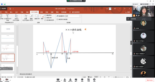 活动分四个环节进行。第一环节自画像。在舒缓的音乐声中,每个人都拿起笔,开始画出心目中的自己。有自己的生肖,有自己的游戏建模......自画像在欢声笑语中展开,别有一番新意。第二个环节OH卡分享。各异的图片被展示在屏幕上,同学们可以选择最打动自己的卡片联想和分享。同学们对OH卡的感受各不相同,有回忆、有现状、有憧憬,大家都以“我”开头给卡片编了生动的故事,侧面反映出大家的内心,让大家对自我有了进一步了解。第三个环节分享自己的生命线。一条直线代表我们的一生,凸起来的上半部分是人生中比较重大的、有意义的事,例如上小学,高考,表白,下方凸出来的,则是比较悲伤的事情或者挫折,例如亲人去世,表白遭拒等等。在这个环节中,同学们认真的回忆生命经历,从另外一个角度剖析自己,认识自己。最后,随着一套温柔地“蝴蝶拍”动作,同学们放松自己,与过去的自己和解。