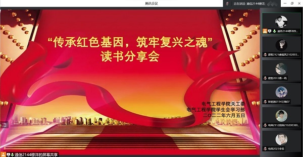 6月5日晚,电气工程学院关工委主办、院学生会承办的“传承红色基因,铸牢复兴之魂”读书分享会在线上举行。本次活动以《习近平与大学生朋友们》、《勋章》为读本,深化主题教育,用身边的英雄模范事迹教育引导青年,推动红色教育热在基层、热在青年,激励青年增强做中国人的志气、骨气和底气。