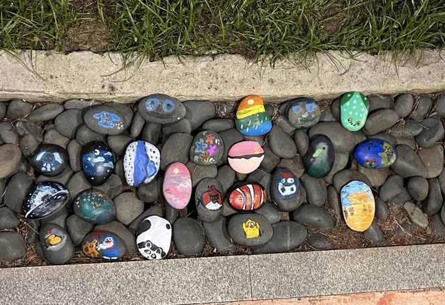 活动结束后,同学们把画好的石头放回河边,作为一道靓丽的风景线装点着校园一隅。