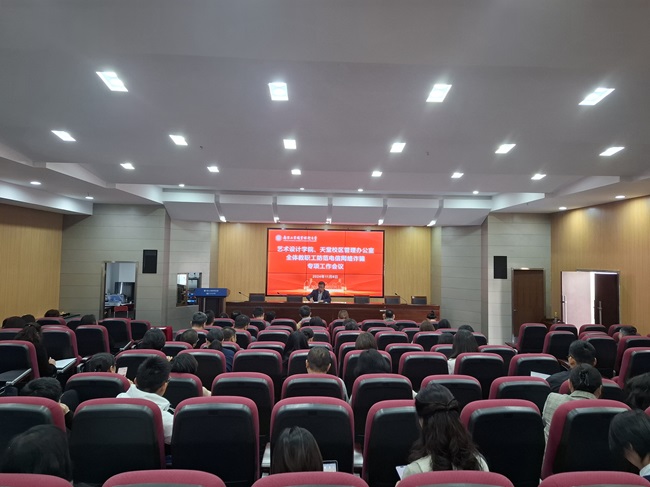 为全面贯彻党的二十大精神和习近平总书记关于打击治理电信网络诈骗犯罪工作的重要指示批示精神,按照省教育厅和学校统一部署安排,11月6日下午,艺术设计学院、天堂校区管理办公室在天堂校区六楼报告厅召开全体教职工防范电信网络诈骗专项工作会议。艺术设计学院、天管办党政领导班子成员、全体教职工参加会议。会议由艺术设计学院院长、天堂校区管理办公室主任孔伟主持。