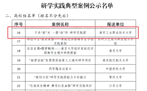 近日,江苏省教育厅组织开展的2024年“苏乡永助”资助育人主题活动评选结果揭晓。经学校遴选推荐、省教育厅组织专家评审,beat365电气工程学院研学实践案例《不负“新”光,一路“培”伴研学实践团》获评研学实践典型案例。
